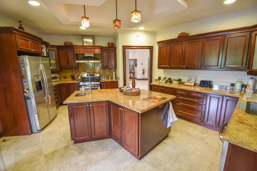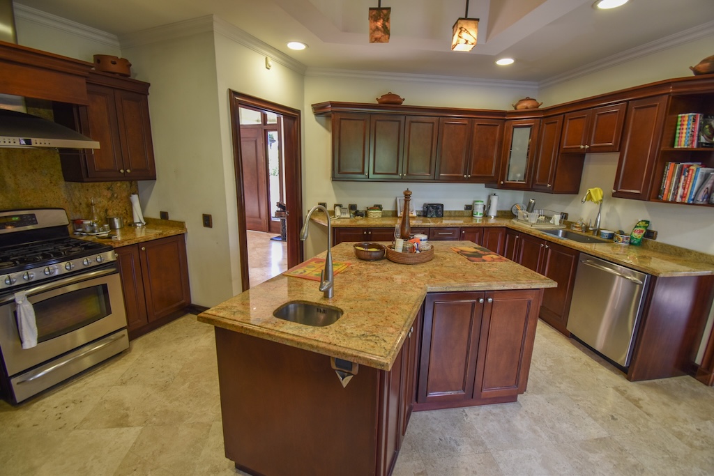 - Cocina moderna con isla central, alacena, extractor, lavaplatos y muebles empotrados