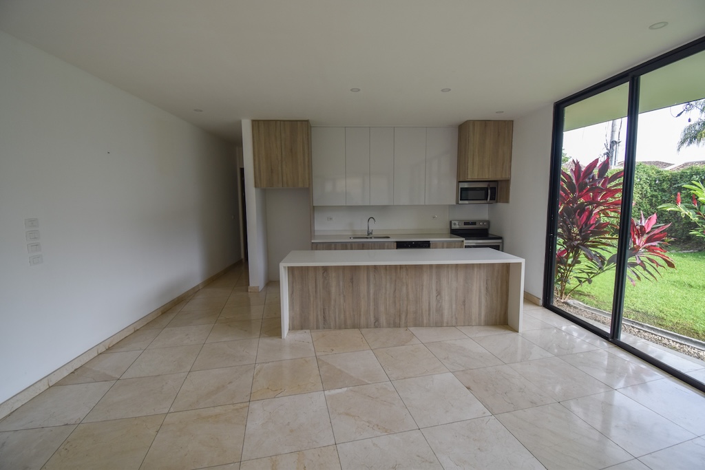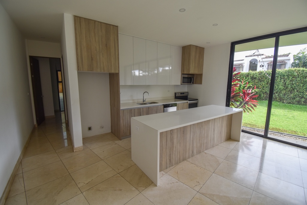 - Cocina integrada con Isla con sobres en cuarzo (Incluye lavaplatos, cocina y microondas empotrado)