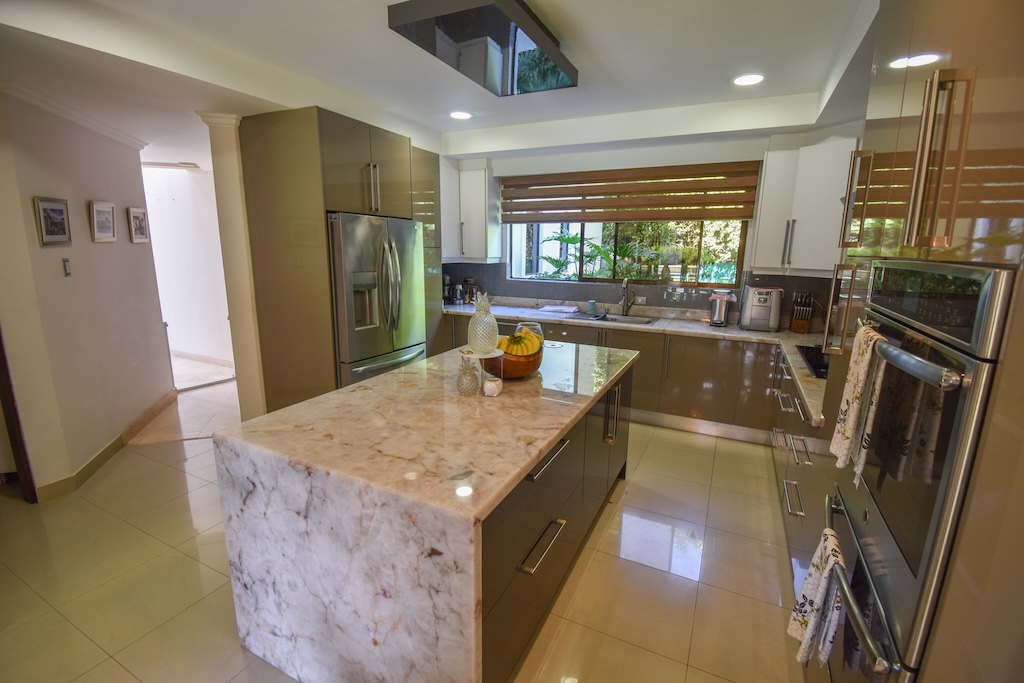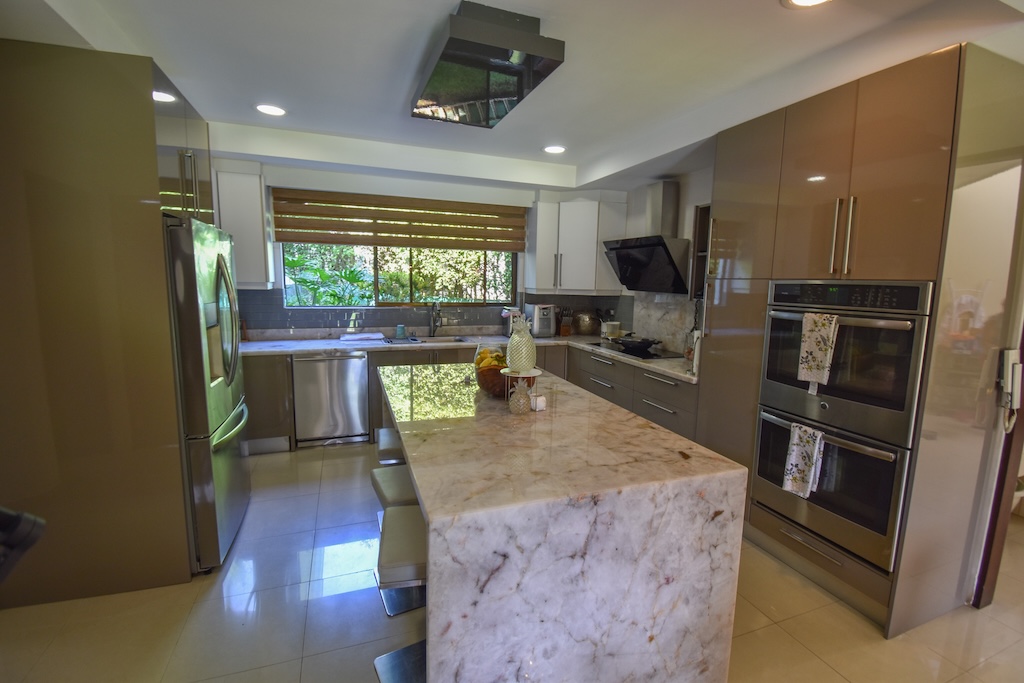 👨‍🍳 Cocina con isla central, desayunador, lavaplatos, plantilla, extractor, torre de hornos y antecomedor