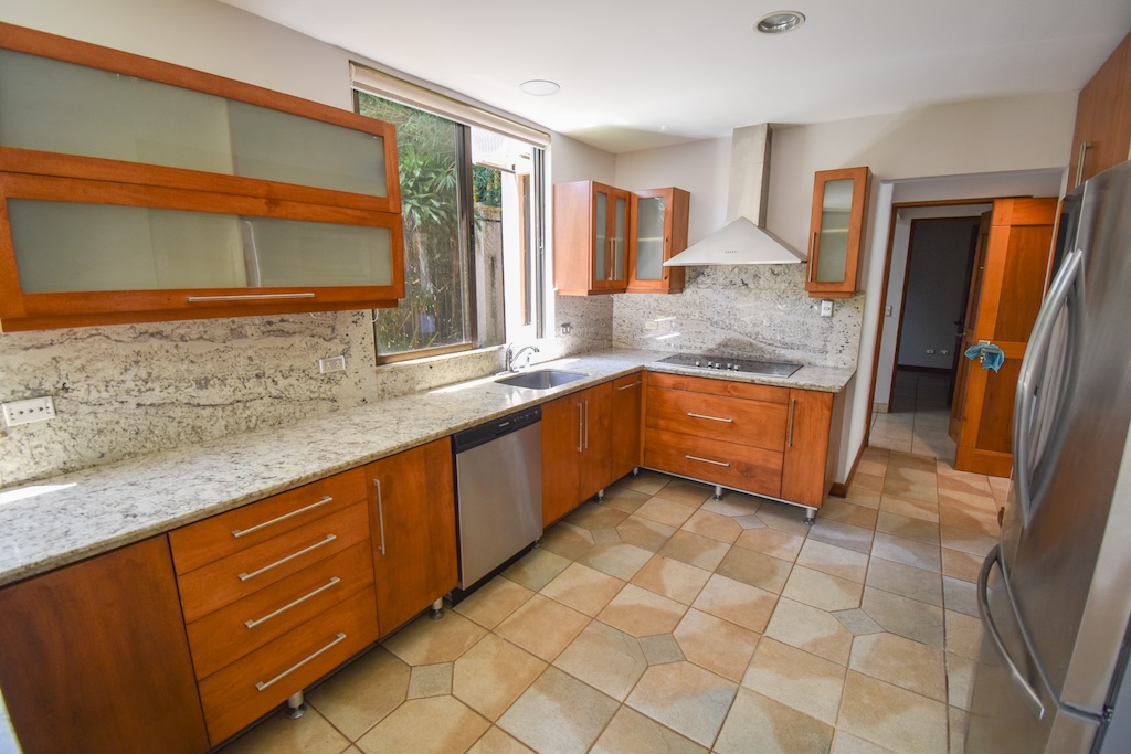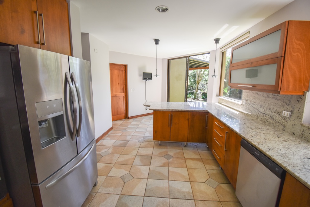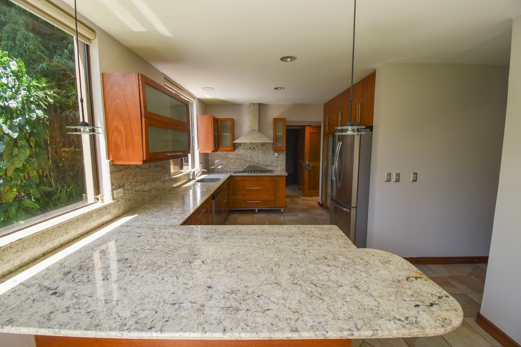 • Cocina con ante-comedor, sobres en granito con desayunador e incluye (Refrigerador de 3 puertas, plantilla eléctrica empotrada, extractor de grasa, lava-platos empotrado, microondas y horno)