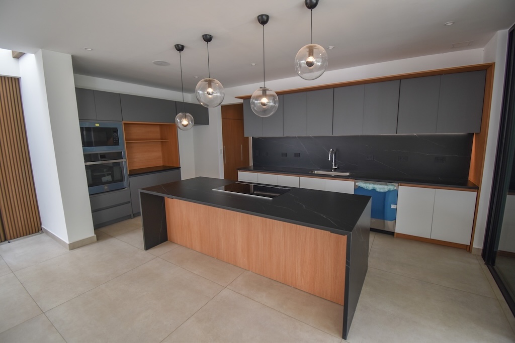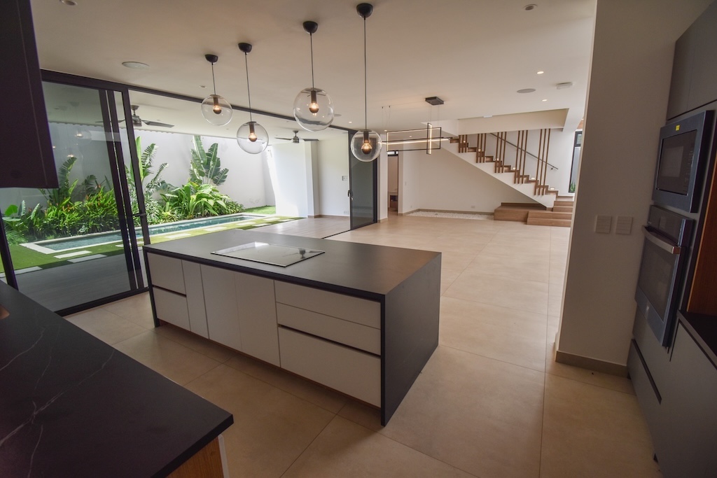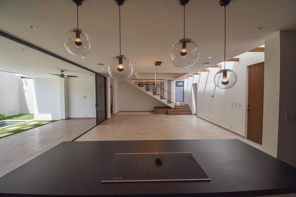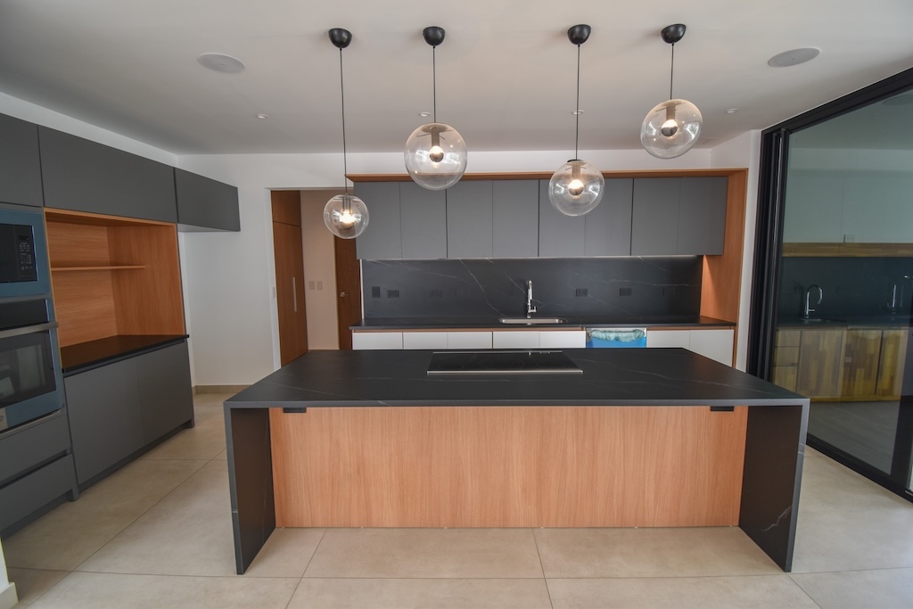 • Cocina con amplia Isla con plantilla empotrada de 4 discos, cuenta con horno, microondas y lavaplatos empotrado