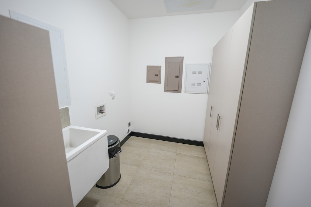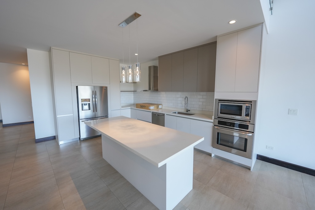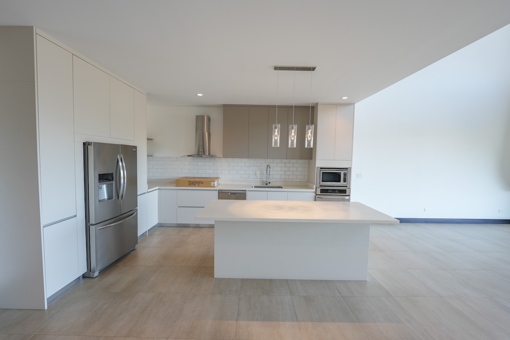 • Cocina integrada con isla con sobres en cuarzo e incluye (Refrigerador, plantilla eléctrica, extractor de grasa, lava-platos, horno y microondas empotrados