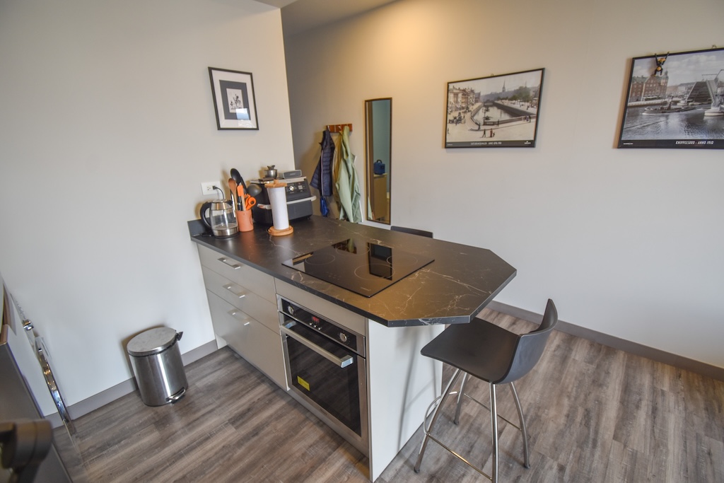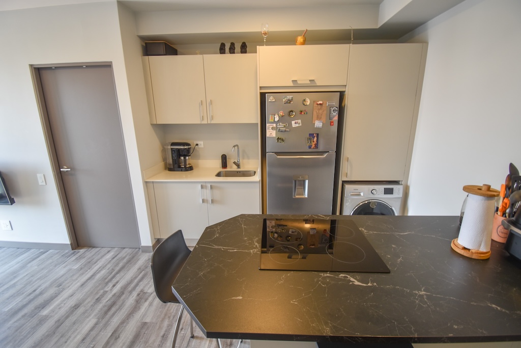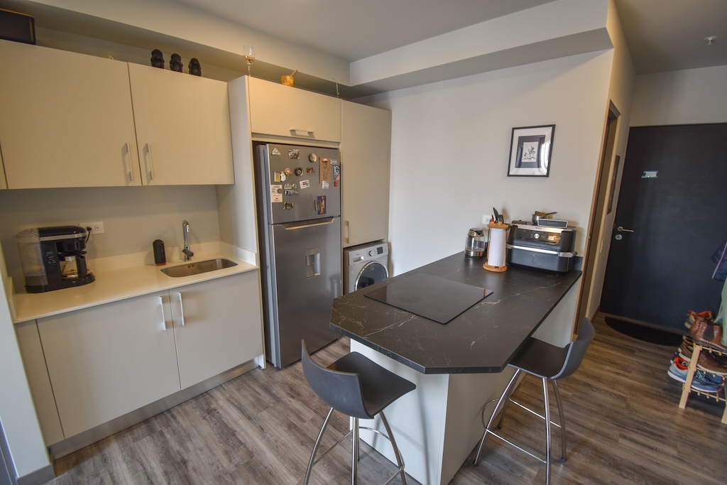 • Cocina equipada con plantilla, horno, refrigerador, lava-seca y desayunador con 2 bancos