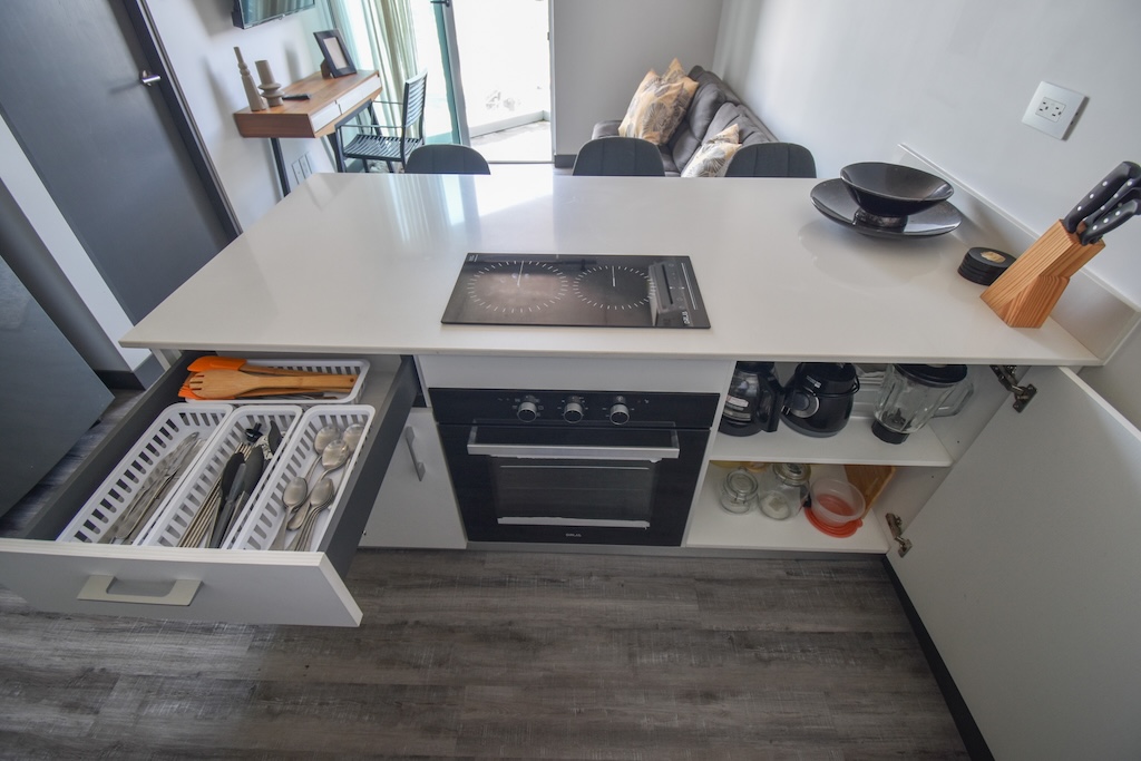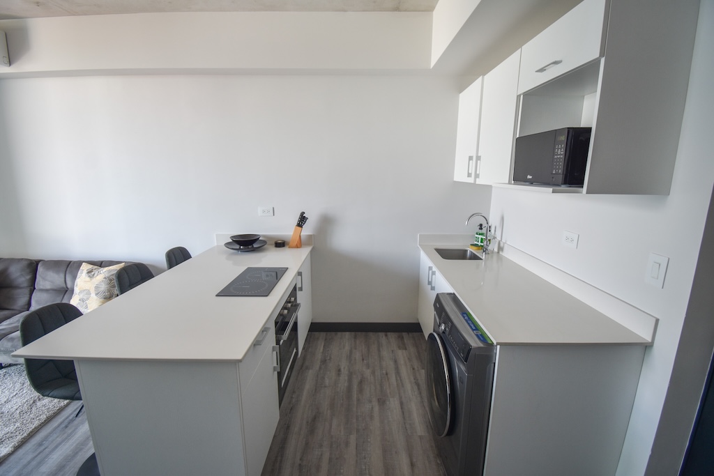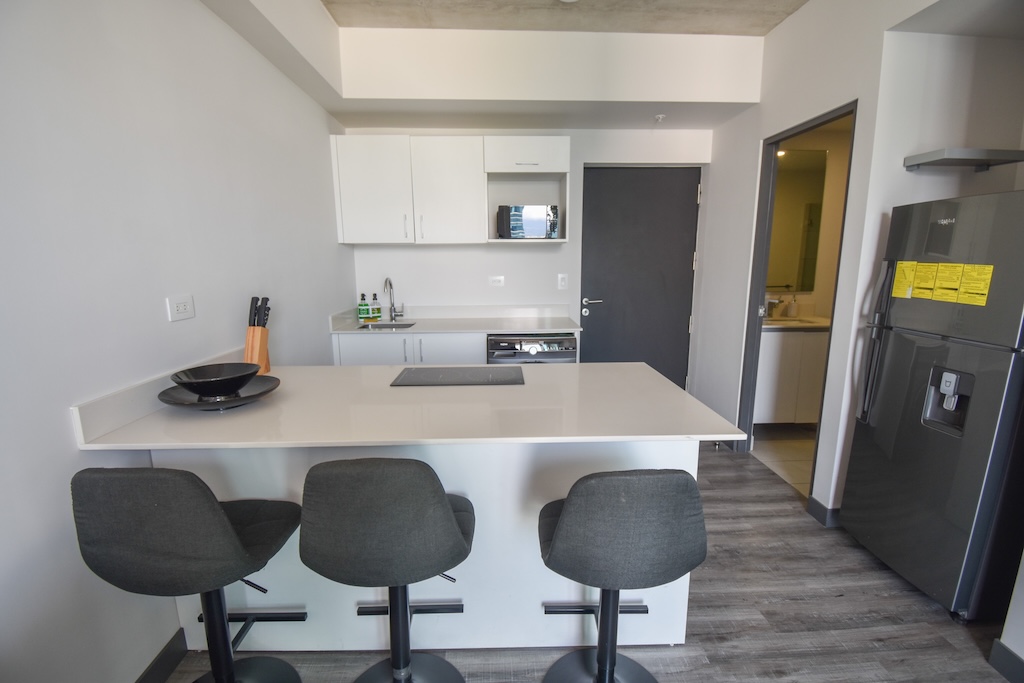 🍽️ Cocina con desayunador, refrigerador, plantilla y microondas