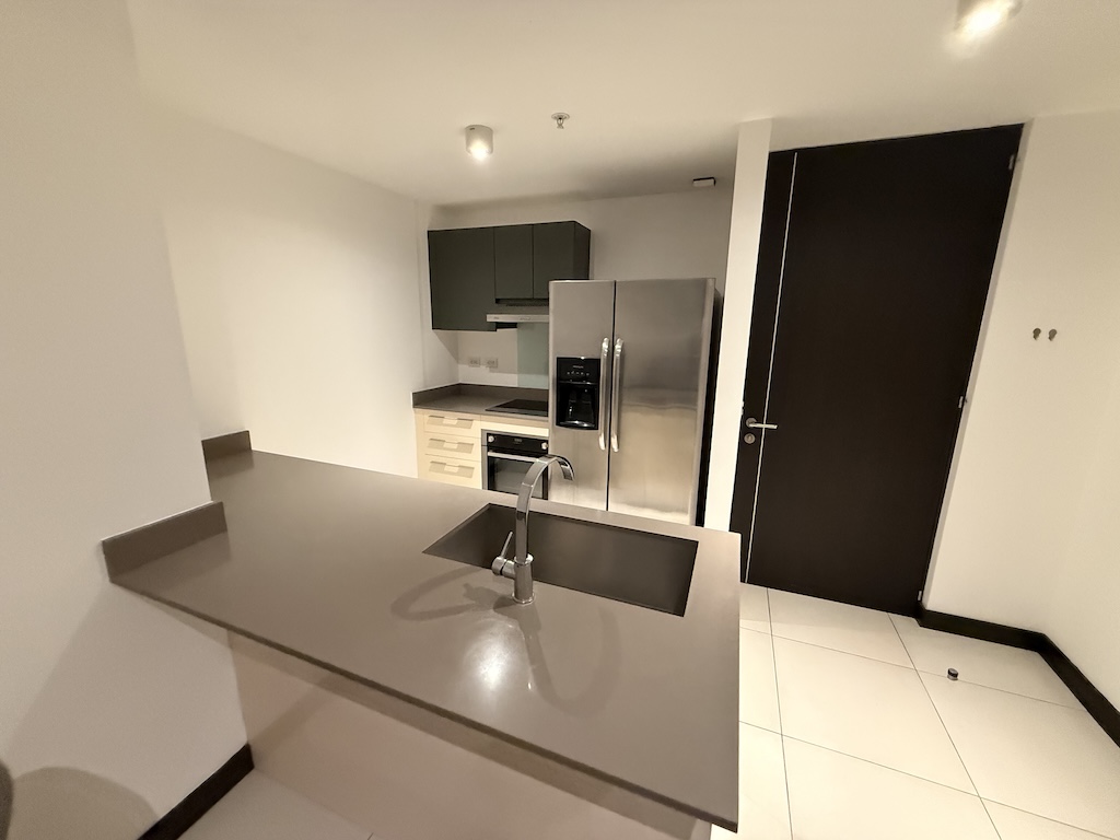 - Cocina con sobres en cuarzo con desayunador cuenta con refrigerador, plantilla, horno, extractor de grasa y microondas.