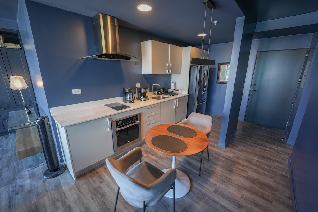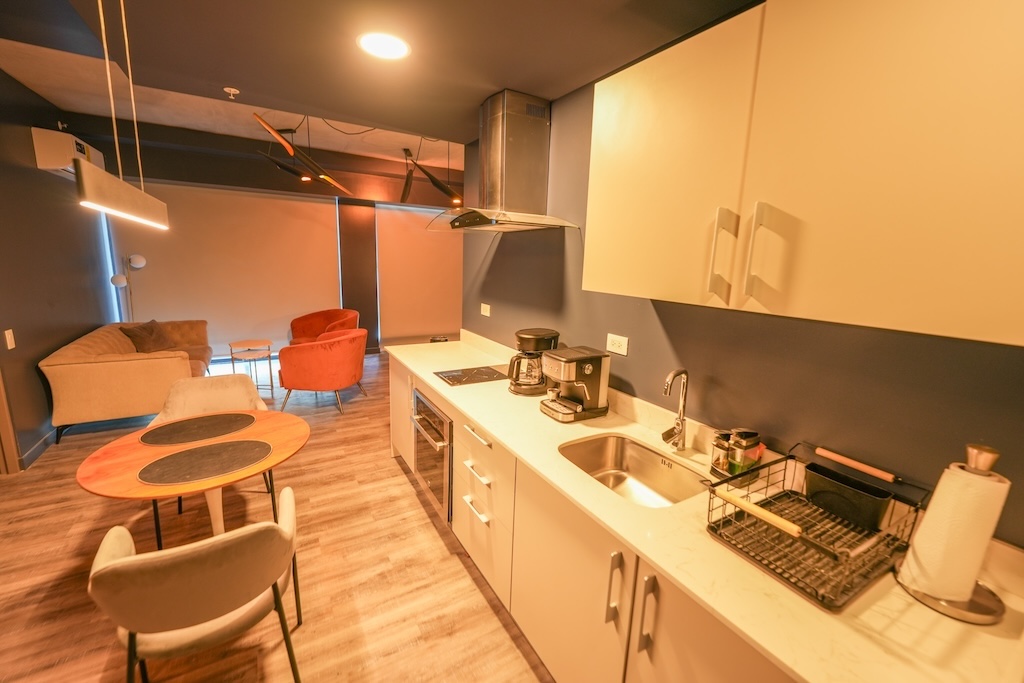 - Cocina con sobres en cuarzo con refrigerador, horno, coffee maker, plantilla y extractor de grasa