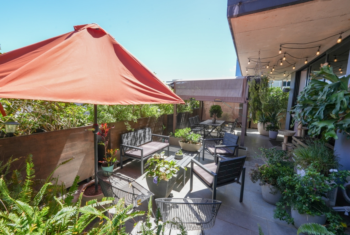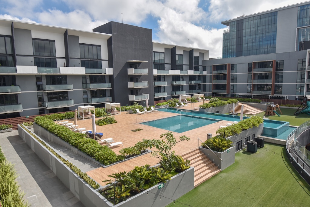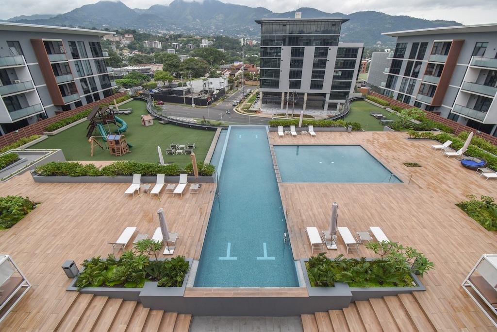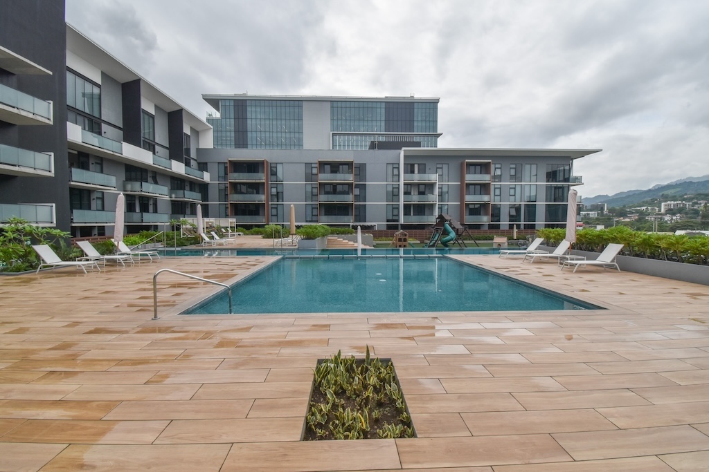 Apartamento esquinero con espaciosa terraza ubicado en el Condominio Escazú Village, el mismo cuenta con 72m2 habitables, 74m2 de terraza y un espacio de parqueo en sótano de 14m2, el mismo está en un nivel 4 y se distribuye de la siguiente manera.