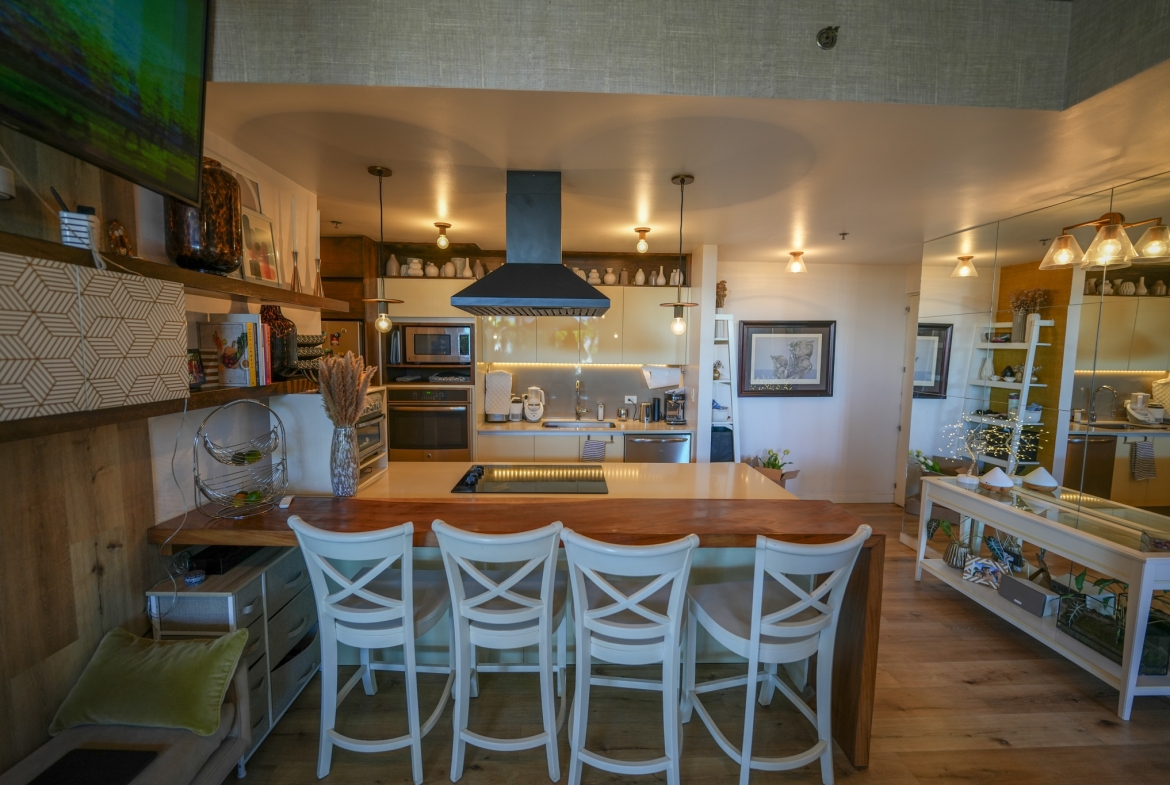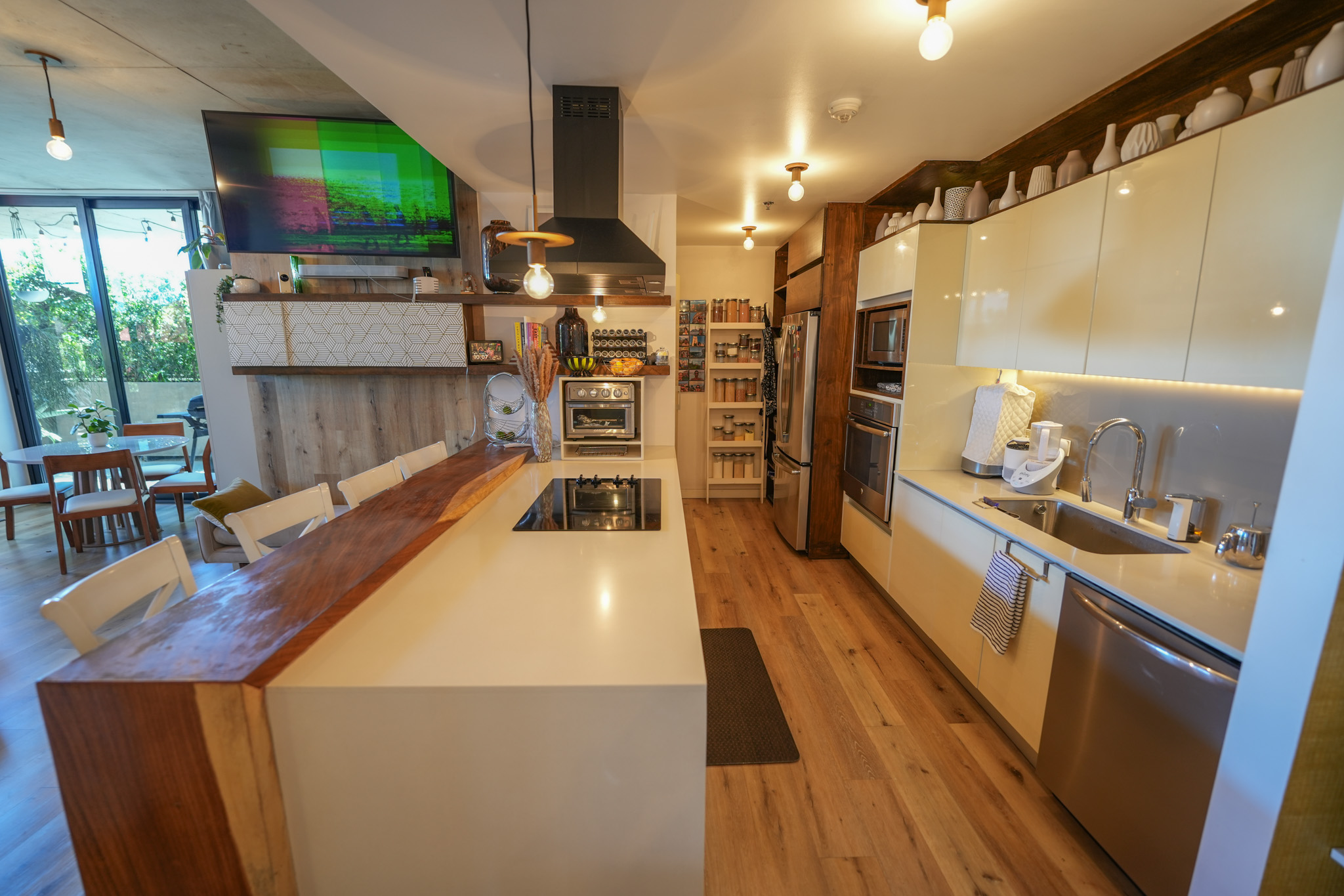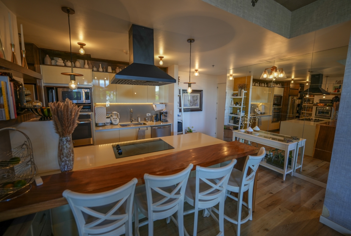 - Cocina con amplio desayunador con sobres en cuarzo integrada al área social