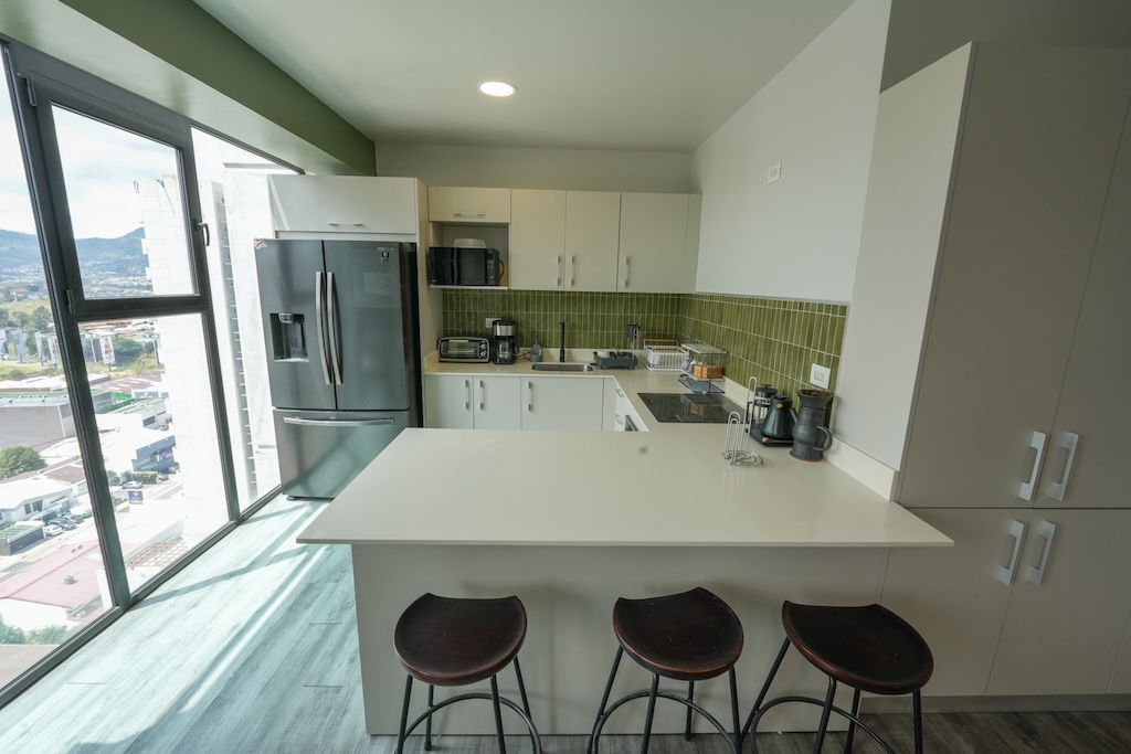 🍽️ Cocina con desayunador equipada con refrigerador, plantilla, horno y microondas