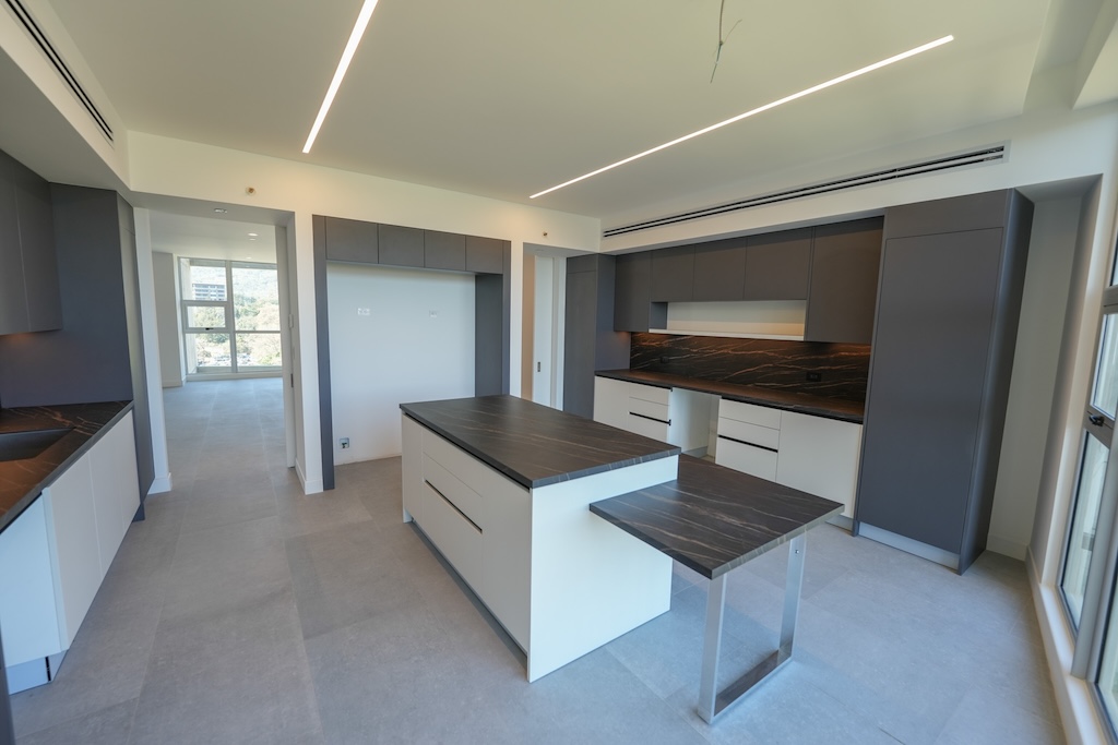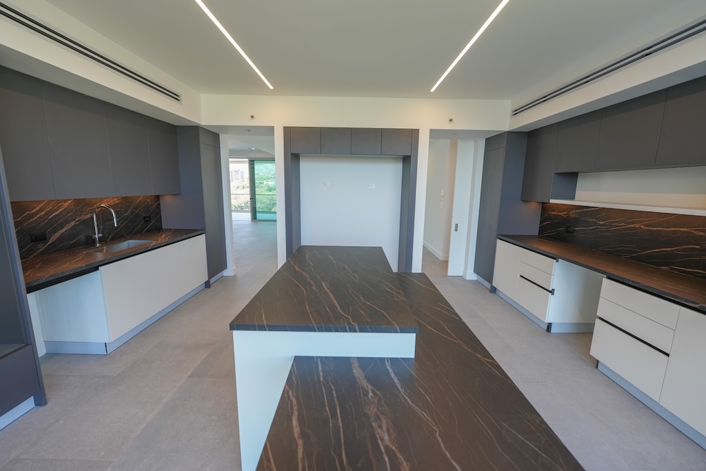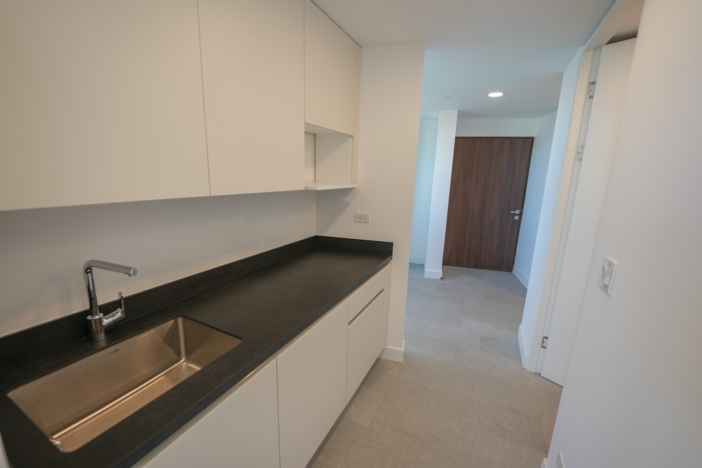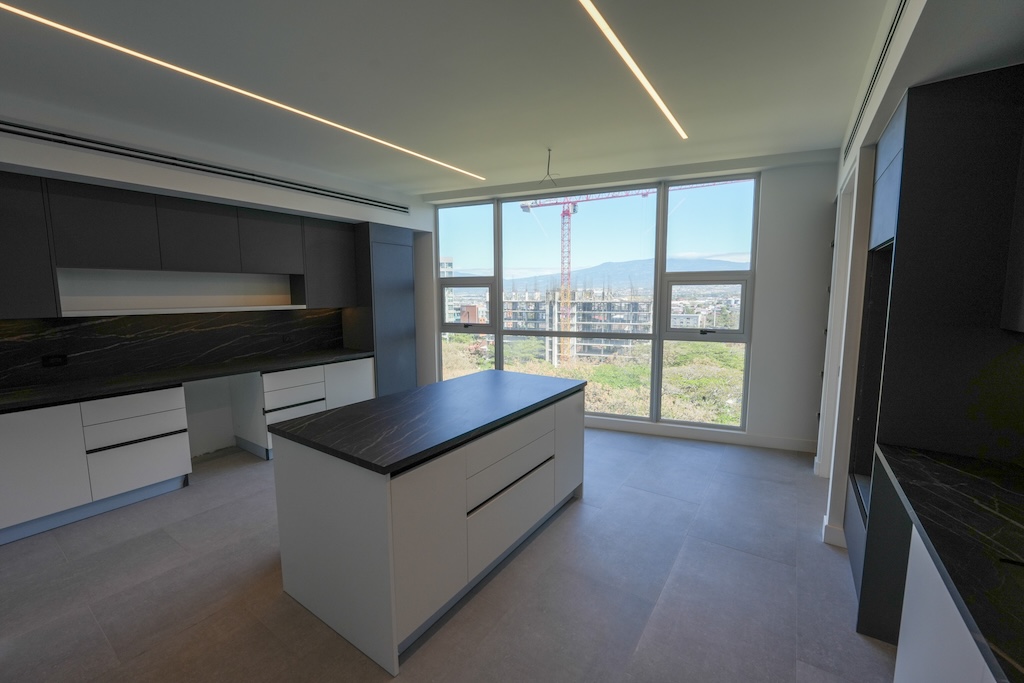 • Cocina con amplia isla con sobres en laminam negros, cuenta con prevista para torre de horno, doble refrigerador, vinera, lava-platos, plantilla empotrada y cuenta con hermosa vista al norte de la capital