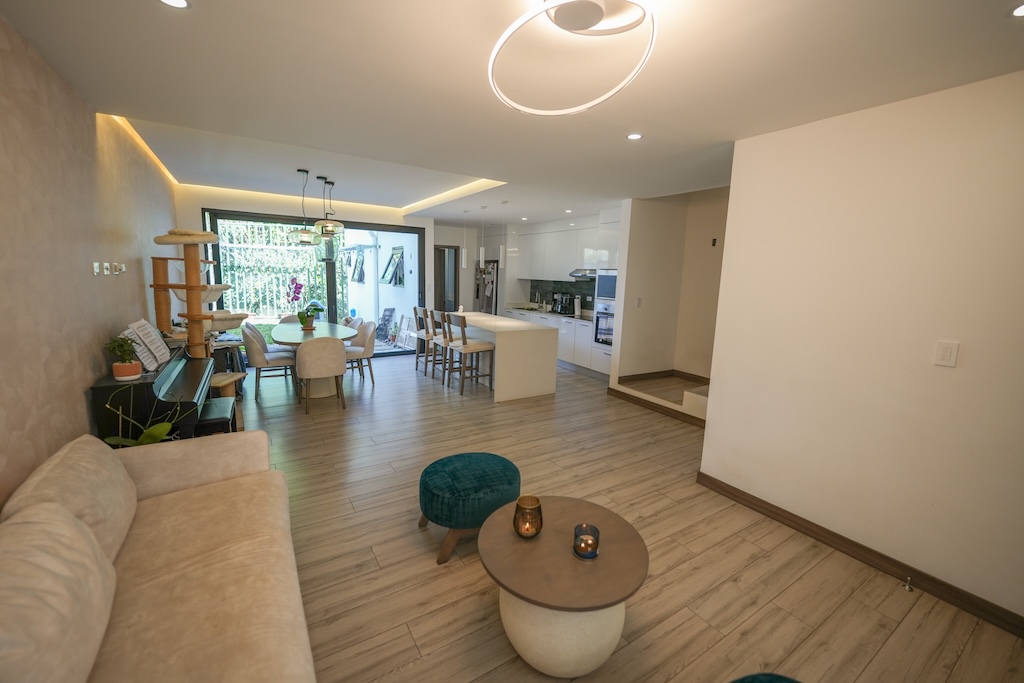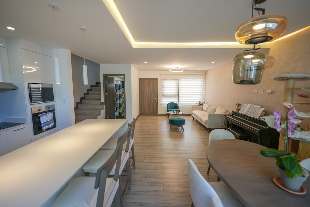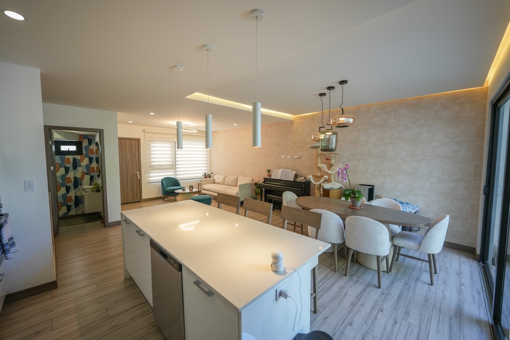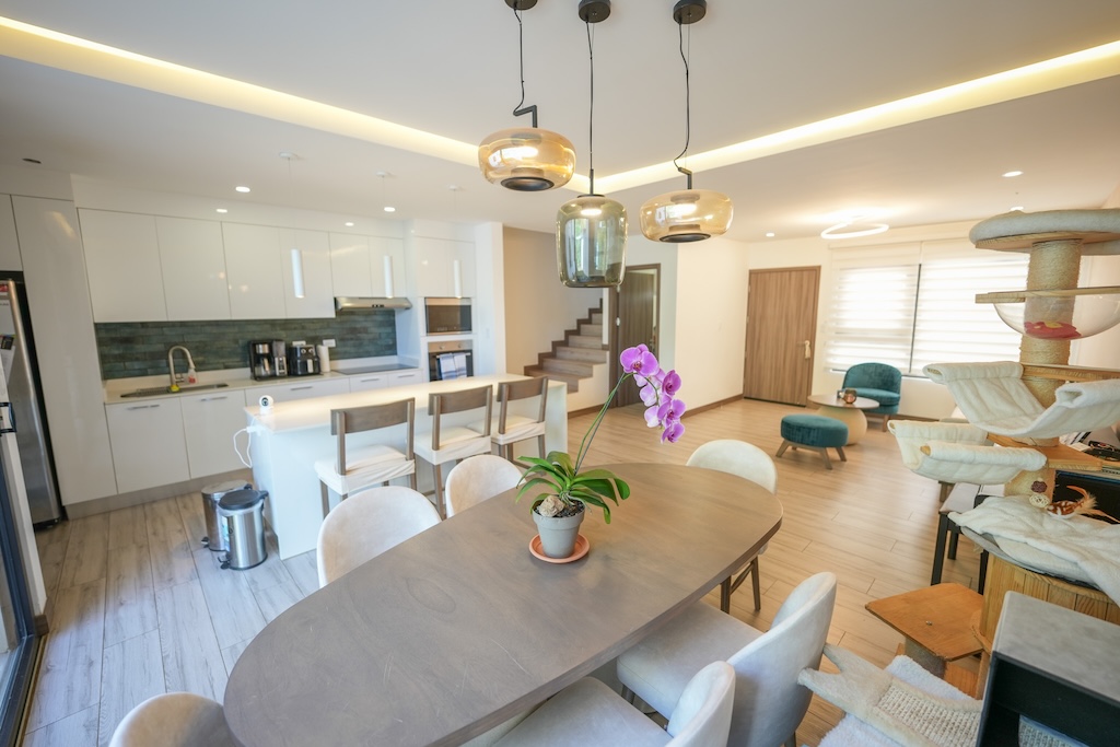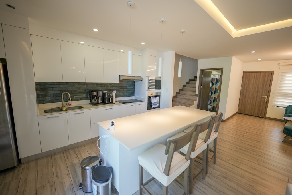 - Cocina con sobres en cuarzo, isla e incluye (Microondas, Plantilla, horno, extractor, y lava-platos empotrados)
