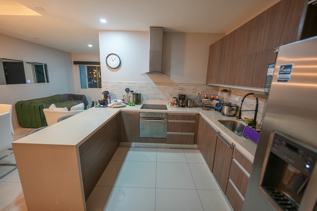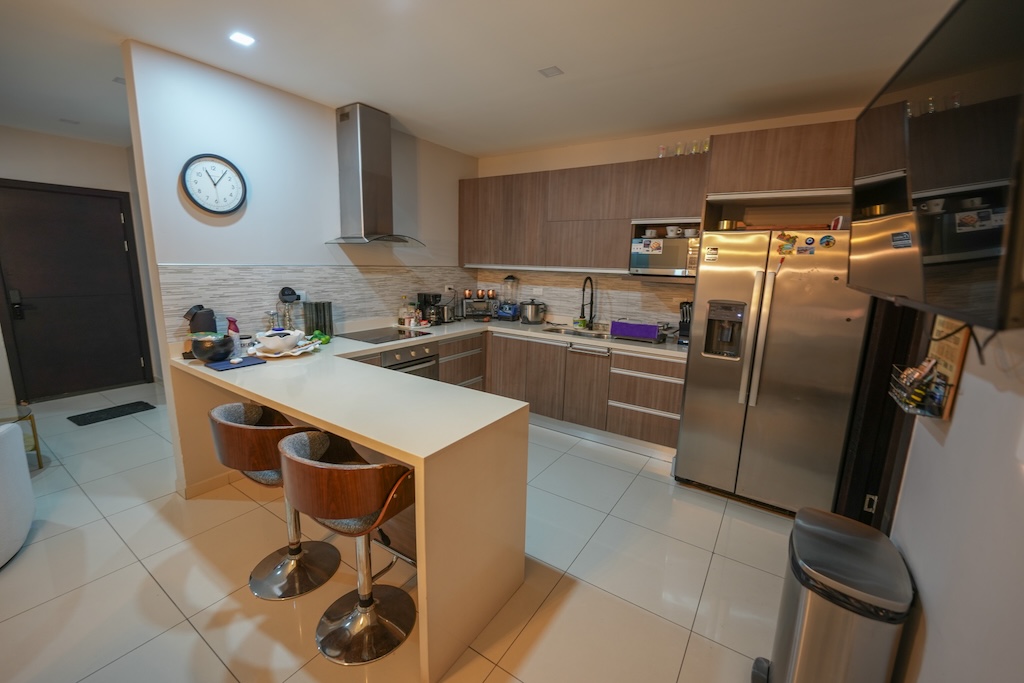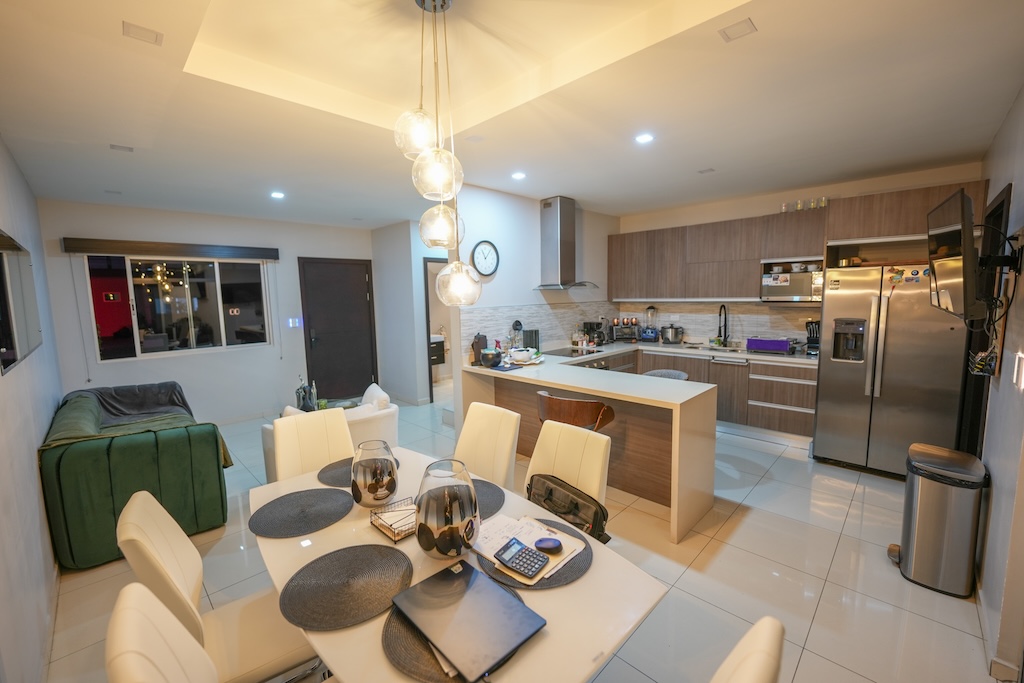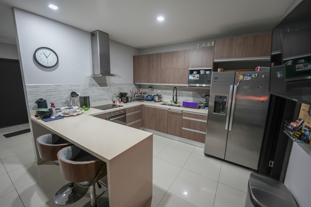 - Cocina con sobres en cuarzo con espacioso desayunador e incluye plantilla empotrada, horno y extractor de grasa