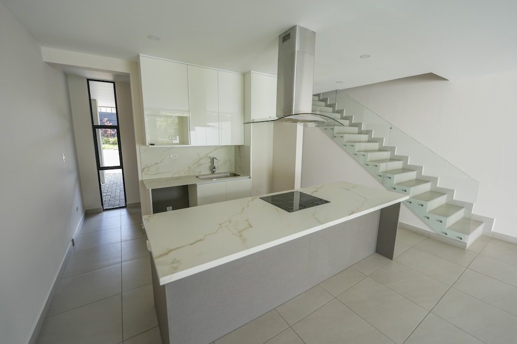 • Cocina con sobres en cuarzo blanco con desayunador con plantilla eléctrica empotrada, prevista de lavaplatos, prevista de horno y extractor de grasa