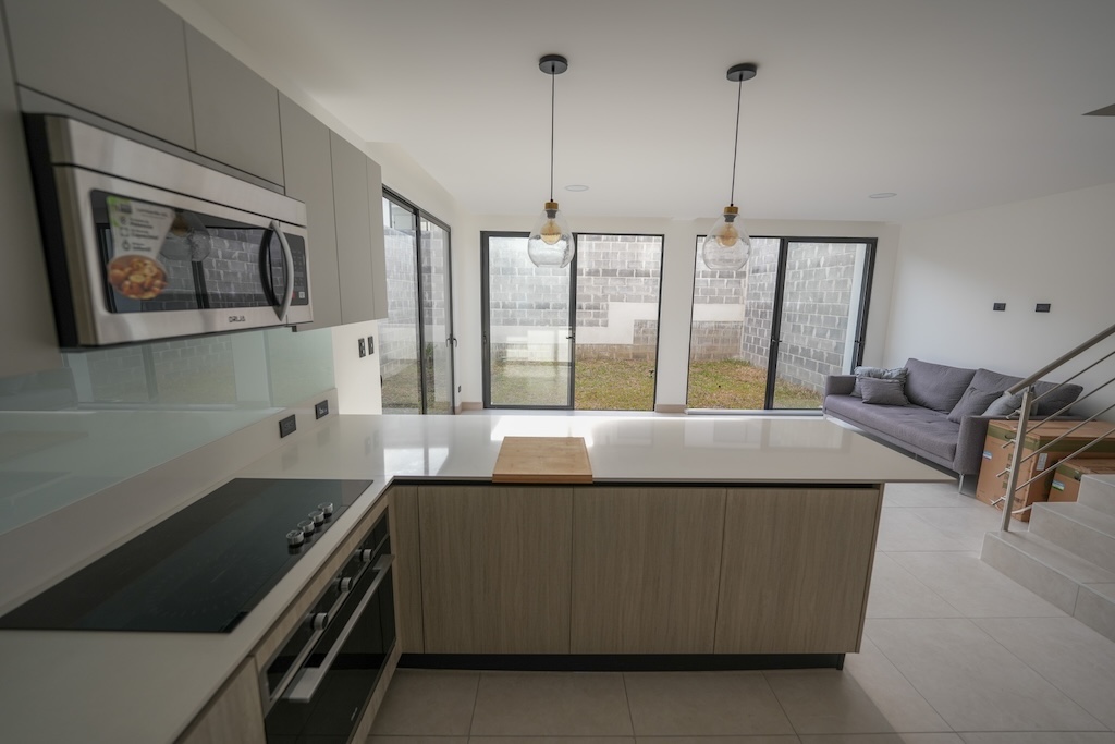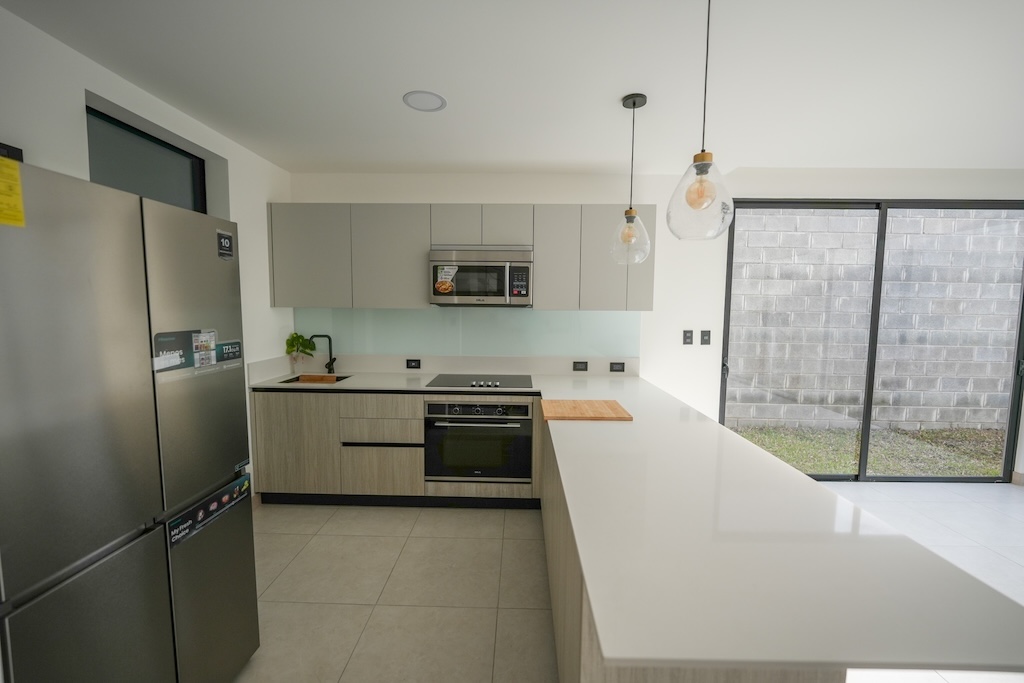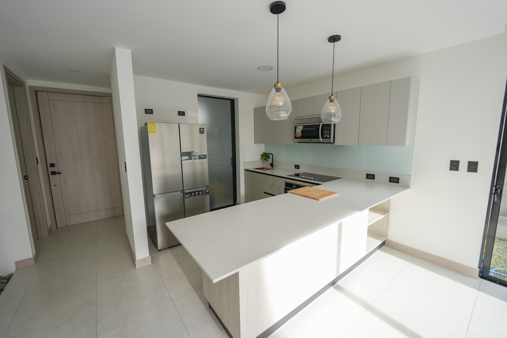 🍽️ Cocina con desayunador, plantilla empotrada, microondas con extractor, horno y refrigerador