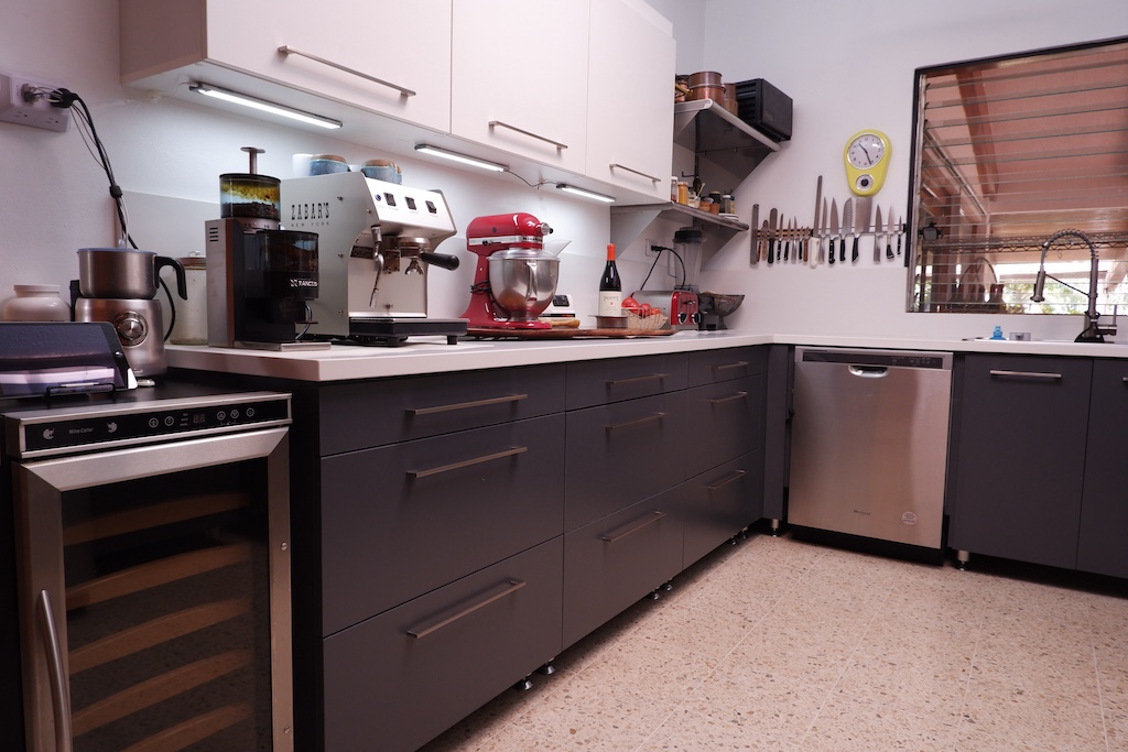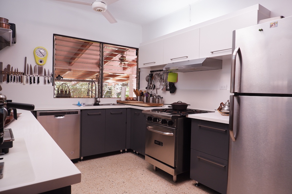 - 🍳 Cocina con sobres en cuarzo, alacena, extractor, refrigerador de vinos, lavaplatos, cocina de gas Asber y menaje completo