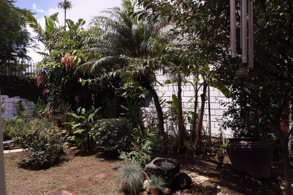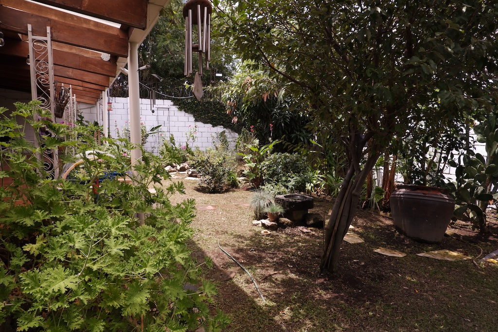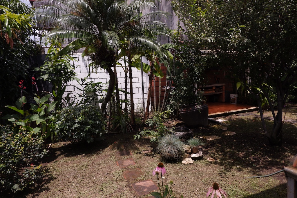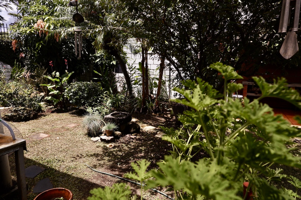 - 🌿 Ante-jardín y jardín trasero con fuente, huerta y árboles frutales