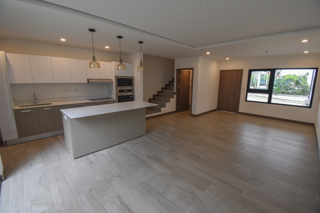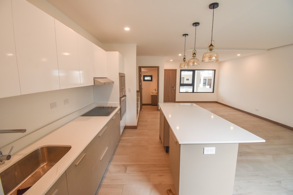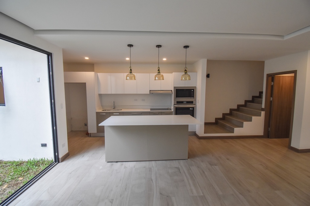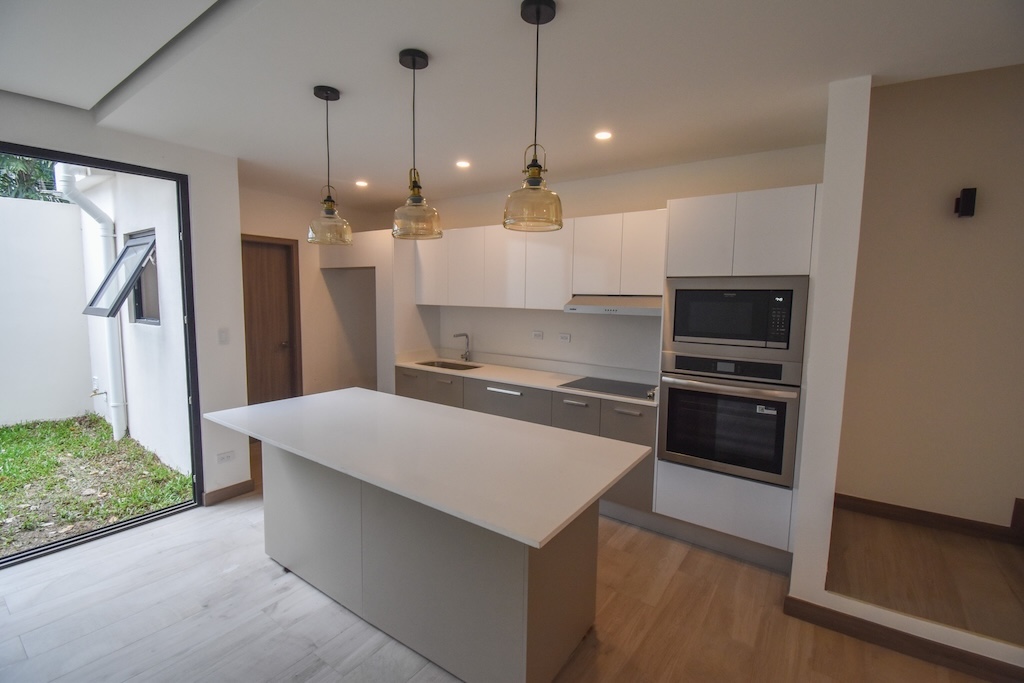 - Cocina con sobres en cuarzo, isla, e incluye plantilla, horno, microondas y extractor de grasa empotrados