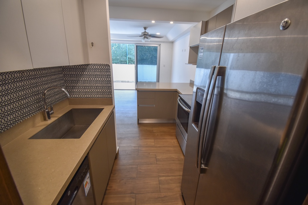 • Cocina con sobres de cuarzo con cocina convencional, lavaplatos, extractor de grasa y área de desayunador integrada al área social
